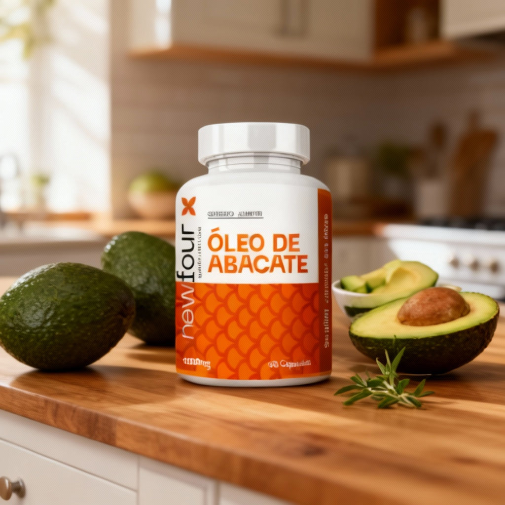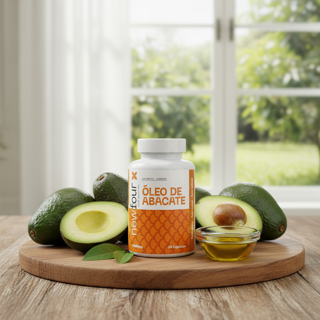 O Óleo de Abacate New Four é um suplemento natural rico em gorduras boas, vitaminas e antioxidantes, que contribuem para a saúde do coração, pele e imunidade. Prático em cápsulas, oferece todos os benefícios do abacate de forma concentrada e fácil de consumir no dia a dia.